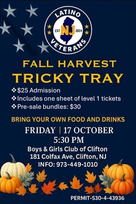FALL HARVEST TRICKY TRAY BRING YOUR OWN FOOD AND DRINKS Images Gallery Image × Set a Reminder Enter your email address below to receive a reminder message. Email address Select the amount of Days before the event -- Select Days Before Event -- 1 Day 2 Days 3 Days 1 Week Captcha Validation Please complete the Captcha Submit Date and Time Friday Oct 17, 2025 5:30 PM - 7:00 PM EDT Location Boys & Girls Club of Clifton 181 Colfax Ave, Clifton, NJ Fees/Admission $25 Admission *Includes one sheet of level 1 tickets Pre-sale bundles: $30 Contact Information 973-449-1010 Set a Reminder Enter your email address below to receive a reminder message. Email address Select the amount of Days before the event -- Select Days Before Event -- 1 Day 2 Days 3 Days 1 Week Captcha Validation Please complete the Captcha Submit Share × Print Email Add to Calendar Facebook Twitter LinkedIn Tell a Friend × Select Calendar Type × Google Yahoo iCal (Outlook, Apple, or other)